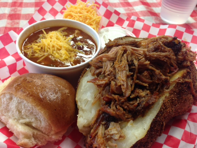 I had lunch Sunday in Las Vegas at Big Ern's BBQ, located at the Downtown Container Park. Loaded, pulled-pork baked potato, with a side of BBQ chili.